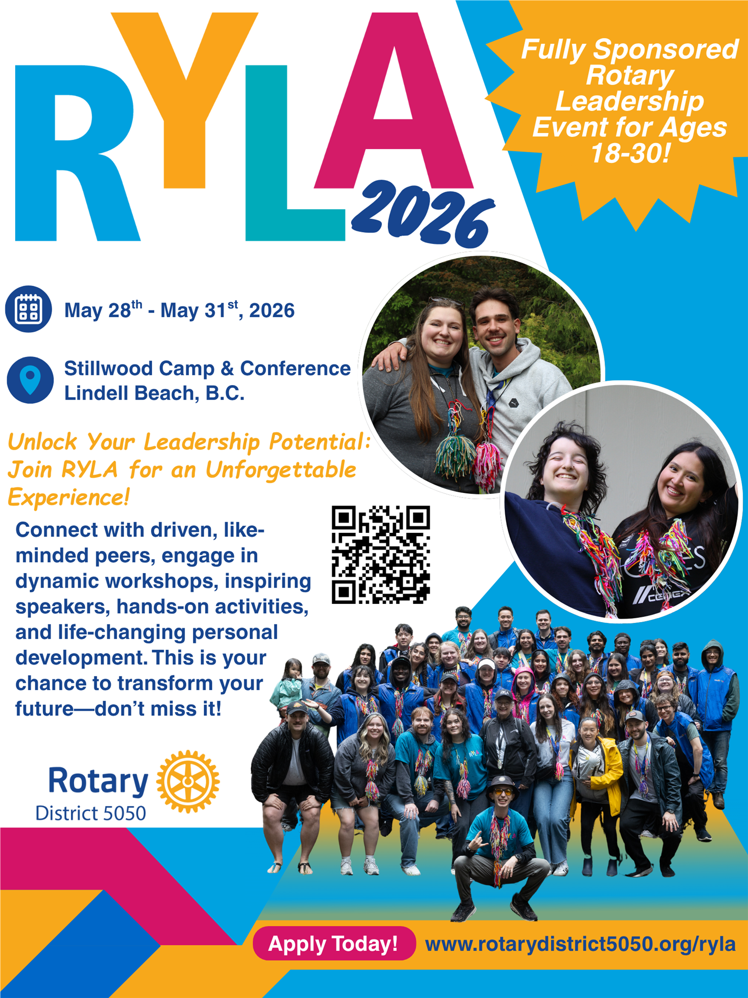 RYLA 2026 will be held at Stillwood Camp in Chilliwack, BC, May 28 - 31, 2026. For more information on the facility, visit their website at https://www.stillwood.ca/.