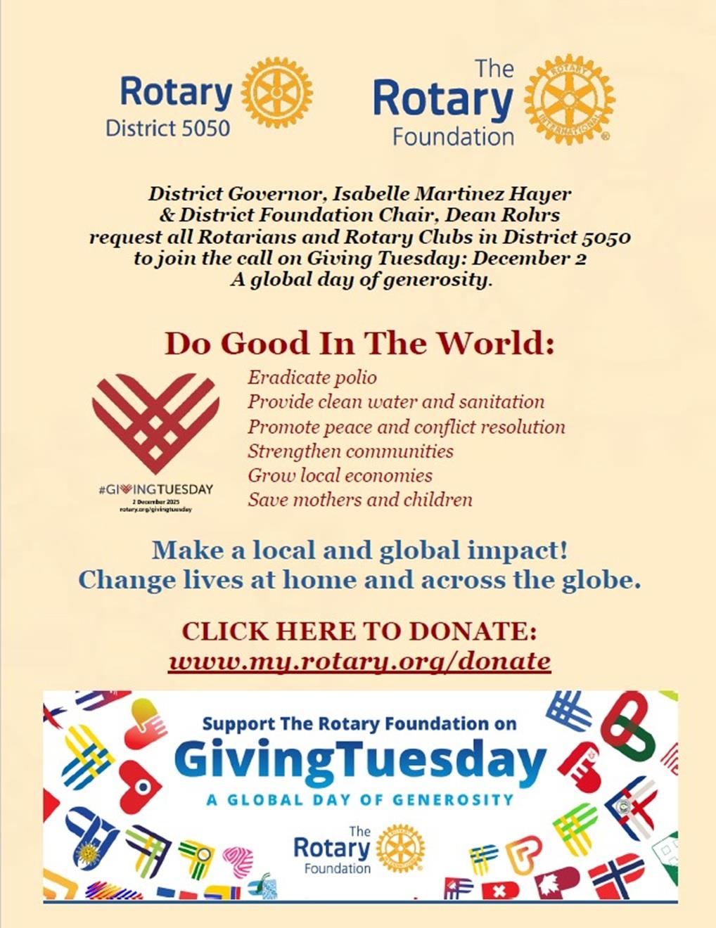 The global Rotary Day of Giving supporting The Rotary Foundation is Tuesday, 2 December. See the article above for more information. This is a wonderful opportunity for you to show your community--whether that be locally, regionally or internationally--that Rotarians are all about Service Above Self.